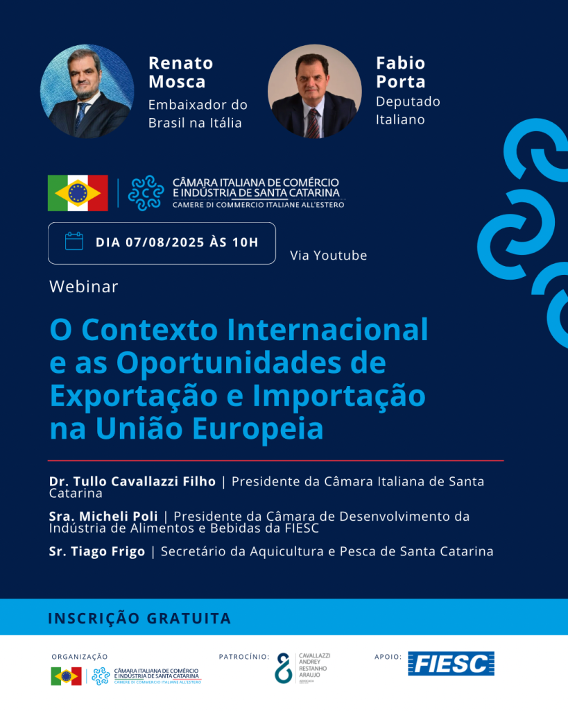 A Câmara Italiana de Comércio e Indústria de Santa Catarina (CCIESC) convida empresários e profissionais para o webinar “O Contexto Internacional e as Oportunidades de Exportação e Importação na União Europeia”. O evento, que acontecerá no dia 7 de agosto, às 10h, será transmitido ao vivo pelo canal da CCIESC no YouTube.