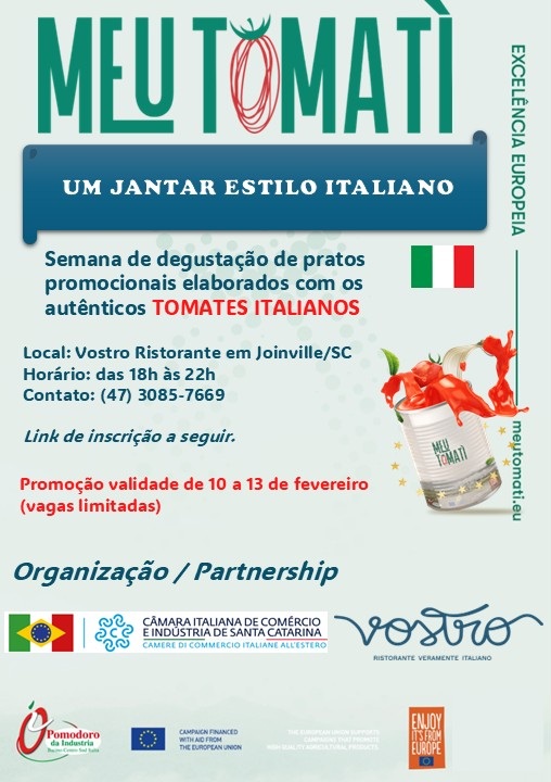 Nos dias de 10 (terça-feira) a 13 (sexta-feira) de fevereiro de 2026, das 18h às 22h30, a Câmara Italiana de Comércio e Indústria de Santa Catarina realizará, no Vostro Ristorante, em Joinville, uma degustação de pratos típicos, regados ao sabor do verdadeiro tomate italiano, no contexto das atividades promocionais do projeto “Meu Tomatì”.